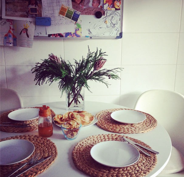 Os Domingos em casa são dia de panquecas. A M. devora panquecas ( e eu e o pai), o Pedro não gosta muito e prefere fruta e iogurte (é o saudável da família, como costumamos dizer!). Eu gosto de me levantar, ligar o rádio antigo que está na cozinha e pôr o CD do Luís Represas. A receita cá de casa é muito simples: um copo de farinha, um copo de leite, dois ovos, uma pitada de fermento, uma pitada de sal e 4 colheres de sopa de açúcar. Frigideira anti-aderente, um bocadinho de óleo, espátula e voilá, em menos de nada temos pequeno-almoço. Depois é só adicionar acompanhamento a gosto - eu sou fã de canela, a M. gosta de mel. Apesar da confusão matinal, é bom sentarmos-nos com calma e comermos sem horários nem obrigações.